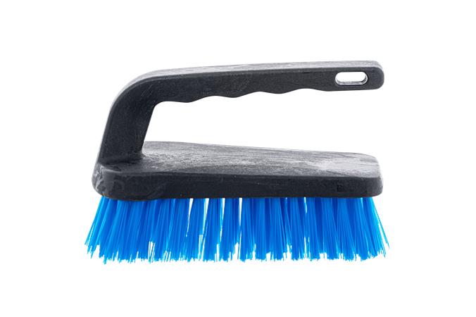 Fogantyús műanyag súroló kefe, műanyag szálakkal, nélkülözhetetlen takarítóeszköz a foltok és szennyeződések eltávolításához.